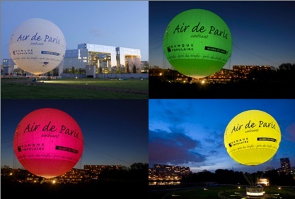 利用創新的技術,法國巴黎空氣品質管理局Airparif在巴黎的天空升起一個大氣球。這個氣球依據巴黎市內六大區的偵測指標,顯示出不同的顏色。如果氣球顏色為,表空氣最乾淨,其次依序為淡綠(表空氣最髒污)。